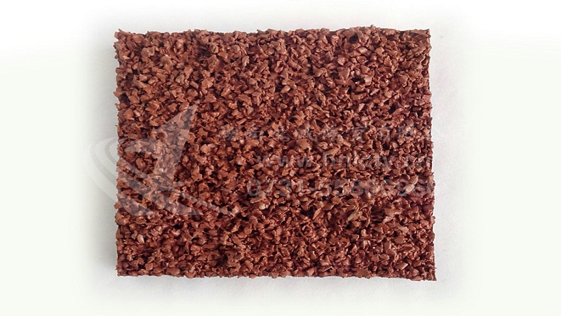 透气型塑胶跑道主要是由高弹性胶粒掺高强度单组份胶水摊铺,面层机械喷涂。